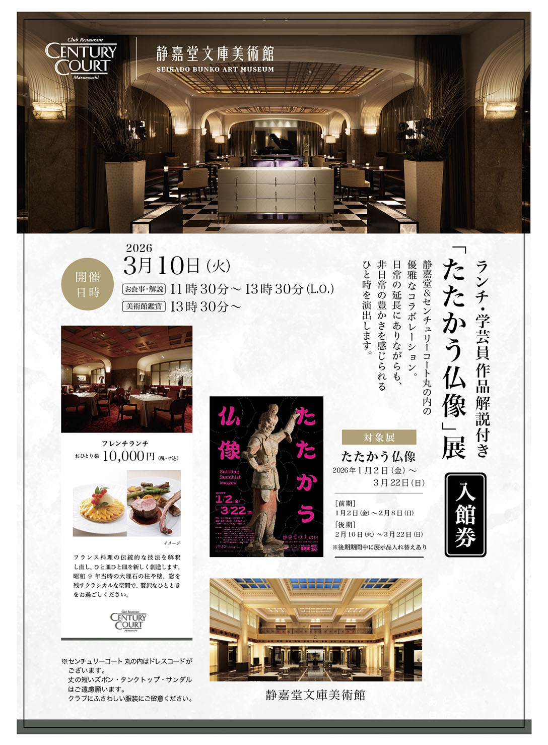 デザートタイムには、特別な空間「センチュリーコート会員専用エリア」にて甘い香りに包まれながら学芸員による「展示会の作品解説」を聴いて頂き、「センチュリーコート丸の内」支配人より内部の歴史と佇まいについてご案内を頂きます。その後、静嘉堂文庫美術館にて「たたかう仏像」展をご鑑賞頂きます。